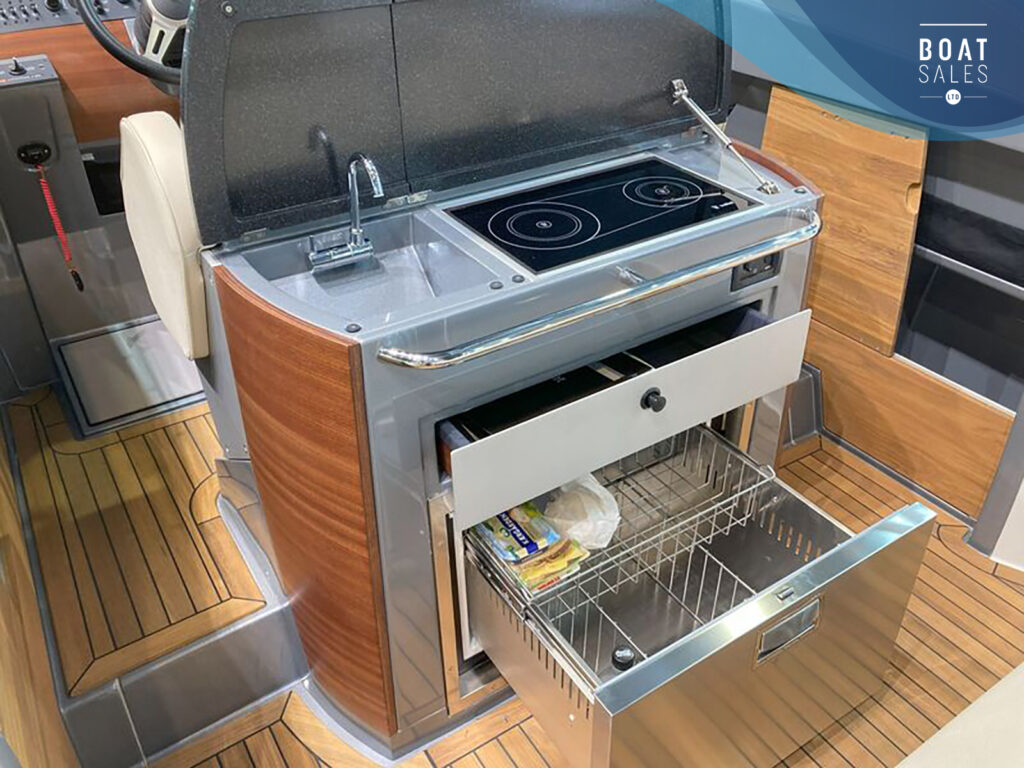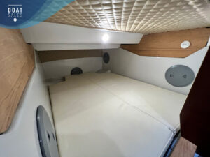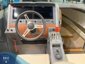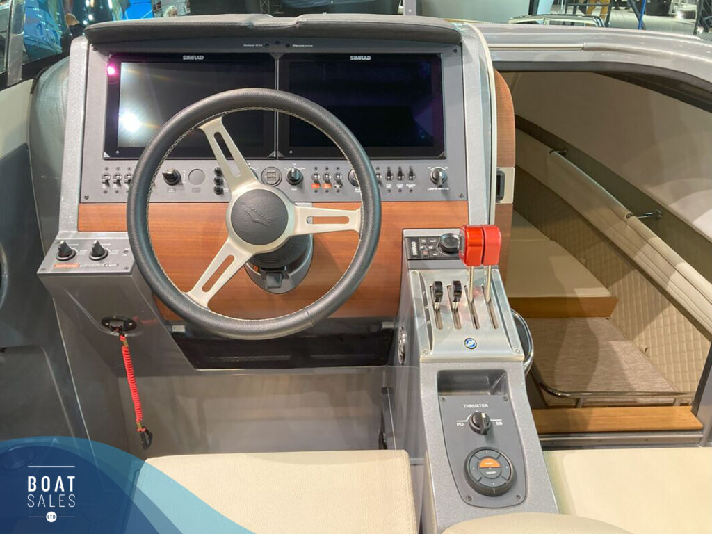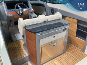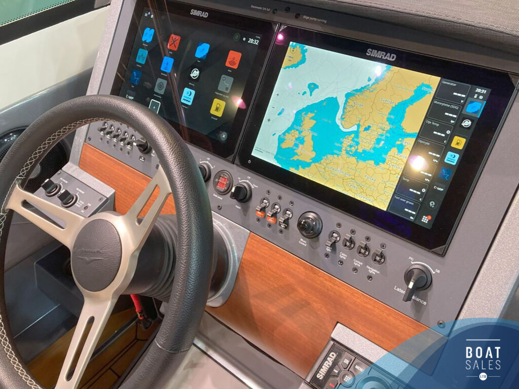 In stock and available now. Cormate Chase 35 Supermarine. She features a comfortable double vee berth forward in the cabin plus small double aft berth, separate wet room custom made out of carbon fibre with marine heads, hot and cold water sink and full height shower. On deck she features a walk around configuration with high sides and easy access to the sunlounging area on the foredeck. Twin supersport racing helm seats with flip up bolsters, full wet bar behind with double ceramic hob, large fridge freezer, carbon storage drawer and built in sink. Seating for 12 including premium teak fold away cockpit table, ample storage lockers and compartments, transom shower, large aft seating arrangement that converts to sundeck, teak cockpit flooring throughout, teak bathing platform, handrails and fender boards. Storm canopy cover, cockpit covers, built in solar panel battery charger, shore power. This boat is powered by twin 6.2L Mercury 350hp V8 sterndrives for approximately 50 knots performance. Single lever Mercury racing digital throttles, high performance steering, twin 12″ Simrad MFD screens, music system with upgraded amp and sub woofer, cockpit lights, bow light, underwater light plus much more