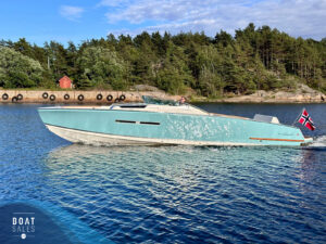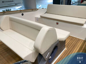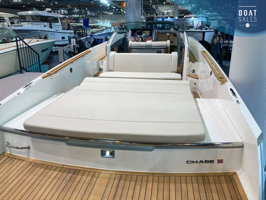 The external width is 255 cm (263 cm with heavy duty rub rail). The makes the Chase 35 easily trailable and even transportable in an open sided container. The narrow beam and the use of; vinylester, unidirectional fiberglass, high quality core materials and infusion technology, makes the boat extremely rigid, strong and light. The rigid and compact hull, the 24,5 degrees deadrise and the 4:1 hull ratio make the Chase 35 cut through big waves in an extremely soft way, without the discomfort of slamming. The reverse rake windshield gives better wind and weather protection, especially when driving half standing in the offshore seats. It also gives more cockpit volume, reduces disturbing reflections with better visibility in rain. All these construction parameters make this boat very suitable as a Chase boat for the Superyacht market.